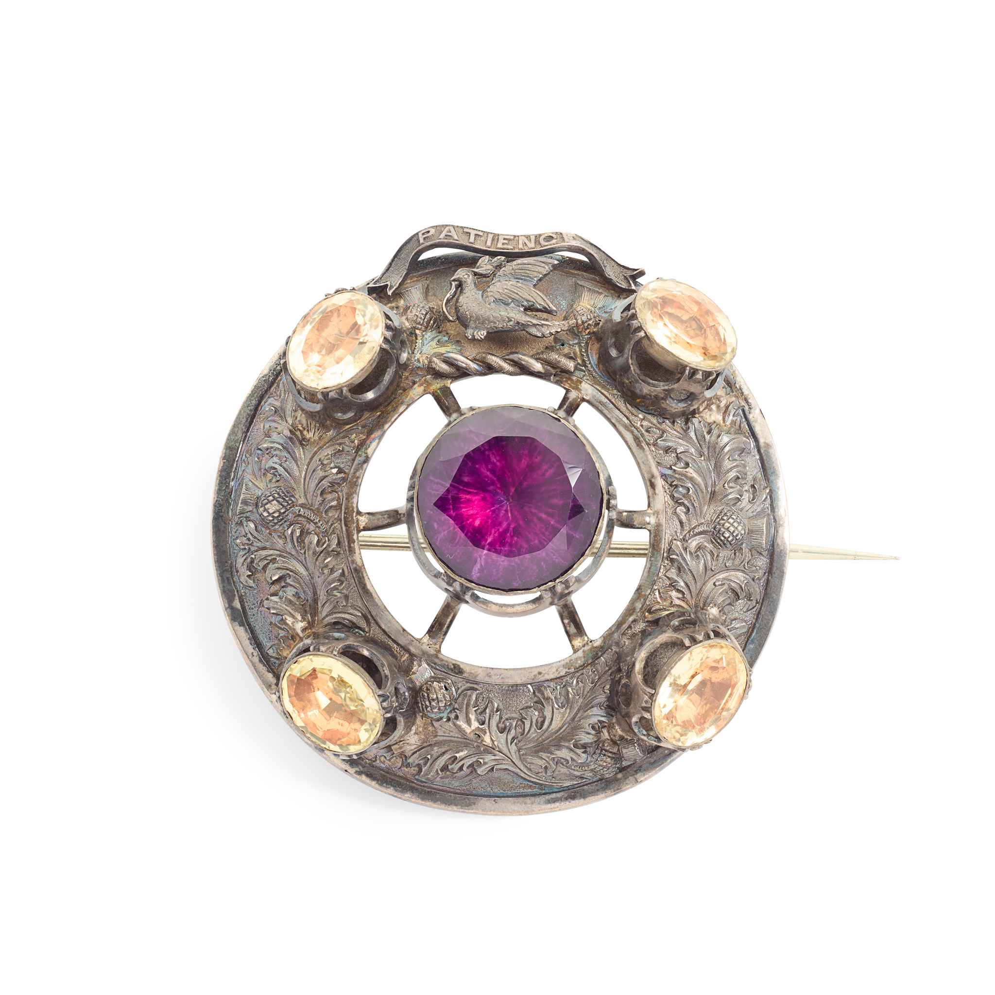 of shaped circular design, the chased thistle motif claw set with four yellow foil backed oval shaped pastes, and another round shaped purple foil backed paste to the centre surmounted by the Clan Laing family crest detailing the phrase ‘patience’