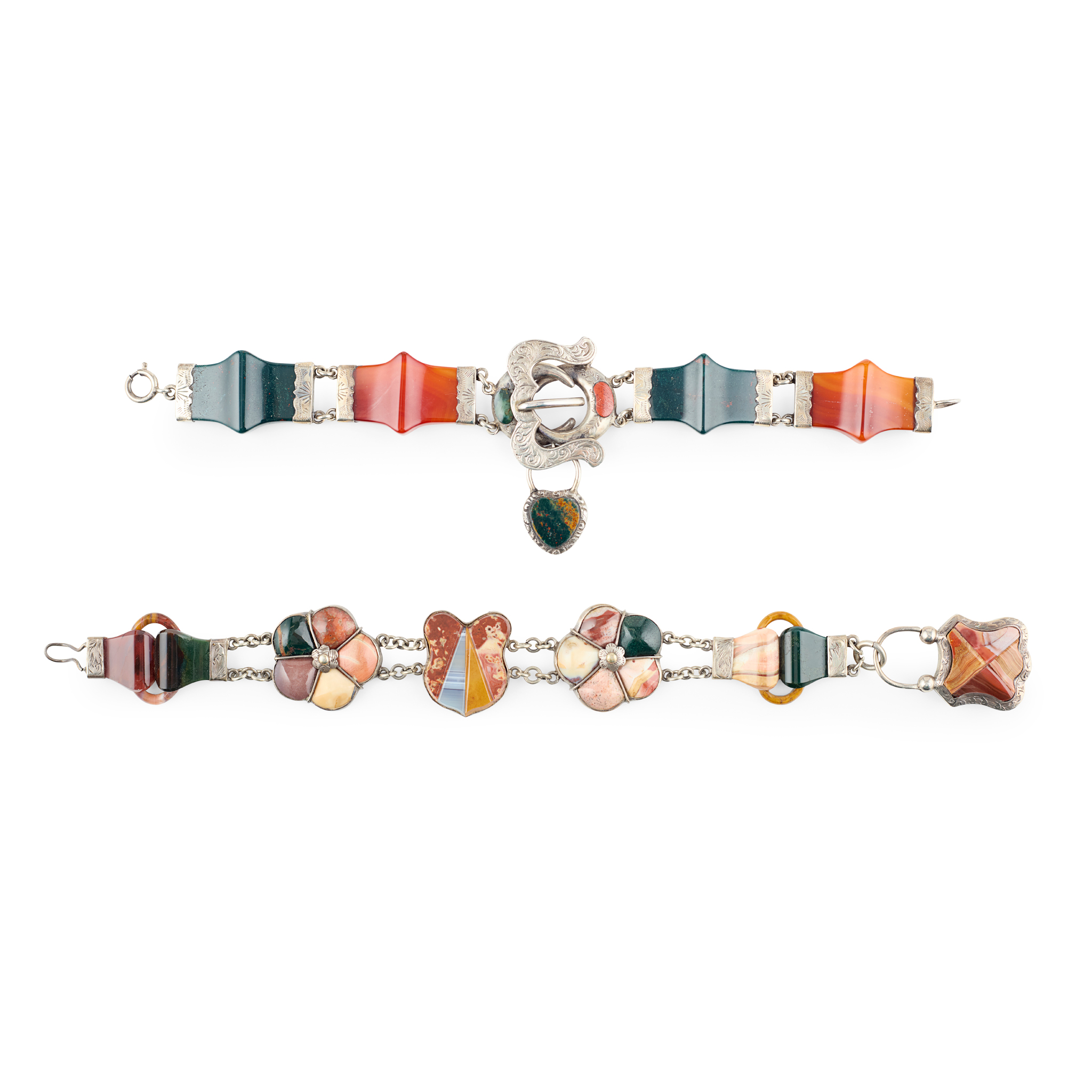 composed of a row of facetted alternating bloodstone and hardstone links, to a central buckle link with heart locket dependent; together with another composed of stylised floral links, each set with vari-hardstones, to a buckle clasp (2)