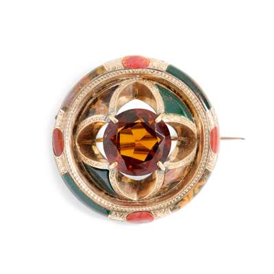 A SCOTTISH MID-VICTORIAN CITRINE AND HARDSTONE MOUNTED BROOCH