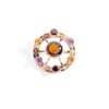 of shaped circular outline, claw set to the centre with Cairngorm citrine, the outer border set with alternating panels of various hardstones, including jasper, bloodstone, and Montrose agate and round brilliant-cut amethysts, citrines, and garnets, modelled in an unmarked yellow metal with brooch and bale fittings