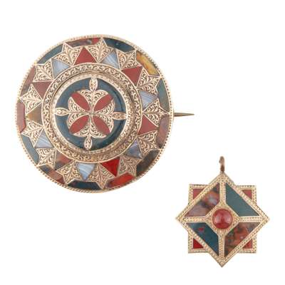 the first of circular outline, set to the centre with a disc of bloodstone and jasper in a quatrefoil motif, to a border of hardstone and engraved scroll work design, to an unmarked yellow metal, with brooch and bale fittings; together with a smaller star shape brooch set throughout with various hardstones with a central domed jasper cabochon, with a glazed panel set to the reverse, to an unmarked yellow metal (2)