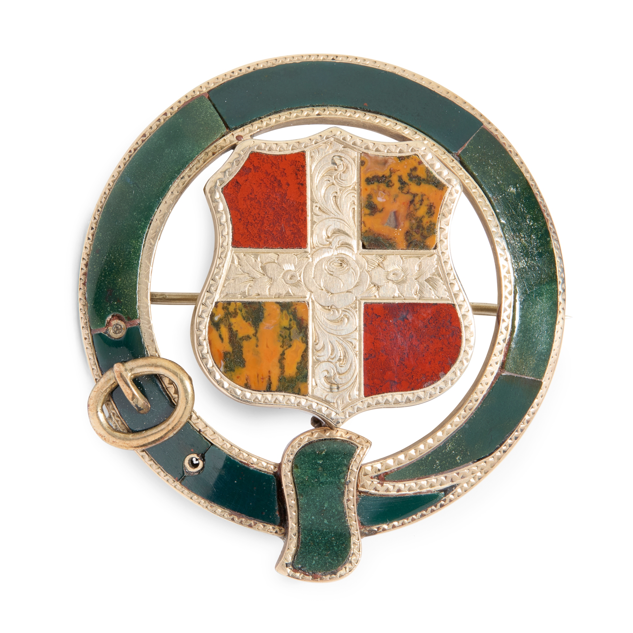 modelled as a shield within a garter belt and set with various hardstones, to an unmarked yellow metal