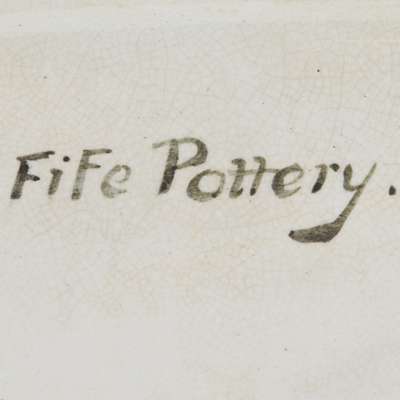 glazed earthenware, moulded and painted on one side with a cockerel chasing a fly, and painted on the reverse with nettles, painted mark FIFE POTTERY