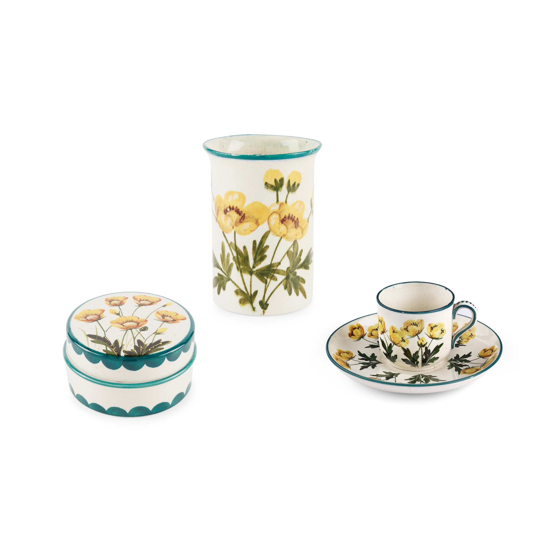 glazed earthenware, unmarked, 8cm high; together with a 'BUTTERCUPS' LOW POMADE, glazed earthenware, painted by James Sharp, painted and impressed maker's marks WEMYSS, 10cm diameter; a 'BUTTERCUPS' COFFEE CUP AND SAUCER, glazed earthenware, painted and impressed maker’s mark WEMYSS, cup 5.5cm high; saucer 12.5cm diameter (4)
