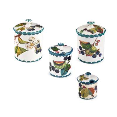 to include a LARGE 'FLOWERING BRAMBLES' PRESERVE JAR & COVER, glazed earthenware, impressed maker's mark WEMYSS WARE/ R.H.& S., printed Thomas Goode & Co. retailer's mark, 16cm high; a LARGE 'BRAMBLES' PRESERVE JAR & COVER, glazed earthenware, impressed maker's mark WEMYSS WARE/ R.H.& S., printed Thomas Goode & Co. retailer's mark, 16.5cm high; a MEDIUM 'BRAMBLES' PRESERVE JAR & COVER, glazed earthenware, impressed maker’s mark WEMYSS, printed Thomas Goode & Co. retailer's mark, 12.5cm high; a SMALL 'BRAMBLES' PRESERVE JAR & COVER, glazed earthenware, painted maker’s mark WEMYSS, painted Thomas Goode & Co. retailer's mark, 7.5cm high (4)