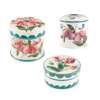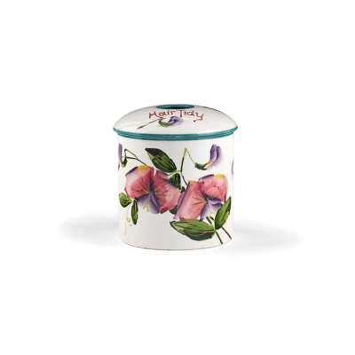glazed earthenware, the cover inscribed HAIR TIDY, painted and impressed maker’s mark WEMYSS, 10cm high; together with a 'SWEET PEA' TALL POMADE, glazed earthenware, painted and impressed maker's marks WEMYSS, 8cm high; a 'SWEET PEA' LOW POMADE, glazed earthenware, impressed maker's mark WEMYSS, 9cm diameter, 4.5cm high (3)