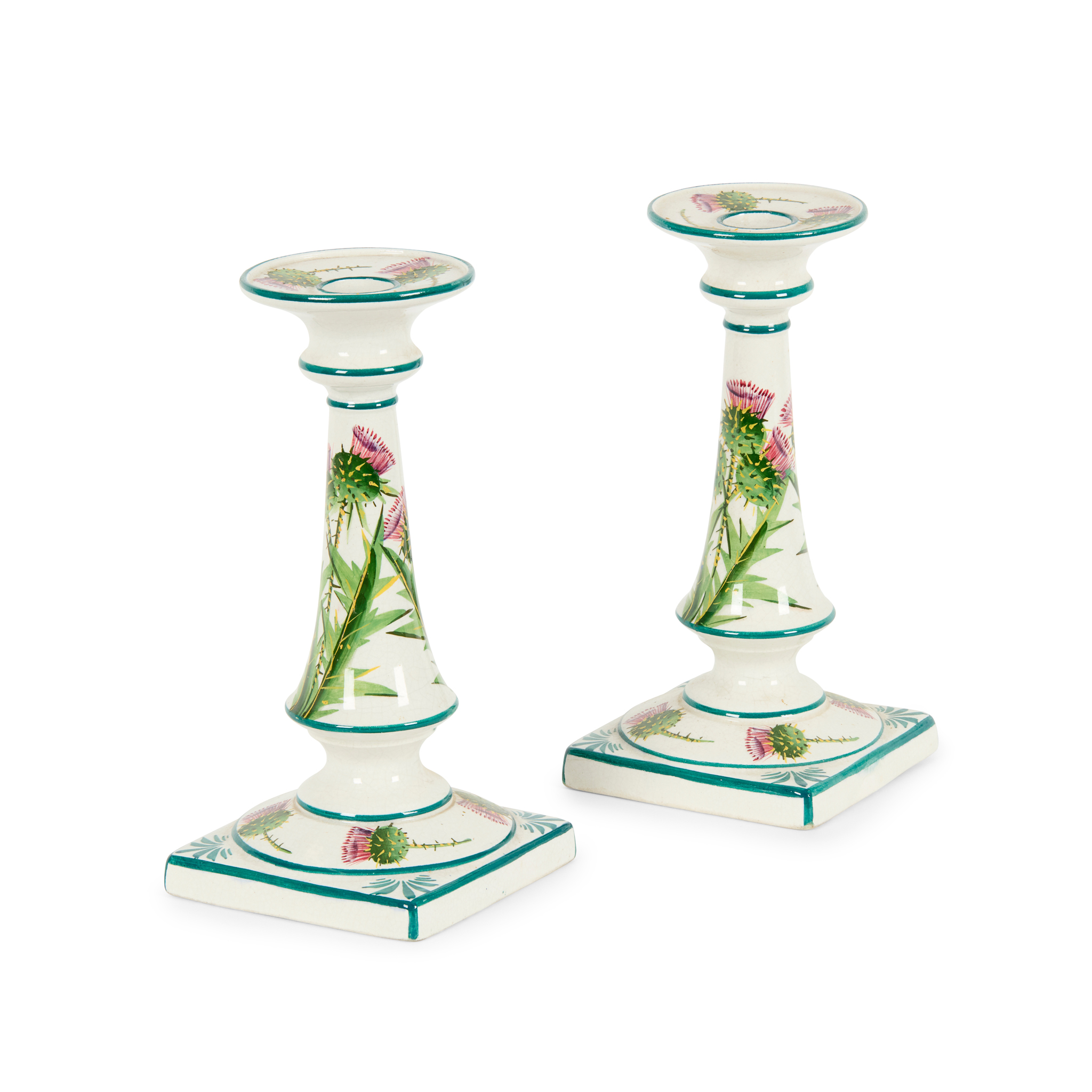 A PAIR OF SQUARE-BASE 'THISTLES' CANDLESTICKS