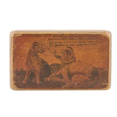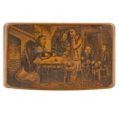 the horn with white metal, the tip with turned finial, the body set with a heraldic crest of a rampant lion holding an axe above a pair of arms swinging a sword with motto ‘Promptus', the top with a collar and hinged horn lid held in thistle mount centred by a cartouche with initials ‘R.C’; together with A MAUCHLINE WARE PENWORK SNUFF BOX, EARLY 19TH CENTURY, the lid with hand-inked scene of ‘The Rent Day’, the sides and base with lattice engine turned style decoration, opening to the remnants of a foil lined interior, the base with a scene of two dogs speaking to each other ‘"But will ya tell me Master Caesar, Sure great folk’s life's a life o'pleasure", “Ird, man. were ye but whyles where I am, The gentles ye wad ne'er envy'em.”' (2)