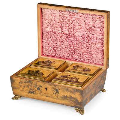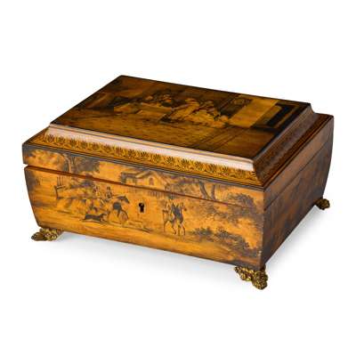 decorated with scenes after David Wilkie, the cavetto moulded hinged lid depicting a domestic scene probably involving payment of rent, the front, back and sides illustrating fox hunting scenes, the interior with a removable divided tray and four boxes, each lid with scenes of everyday life, raised on embossed brass feet, the base of the inserted shelf bearing paper retailer's label 'Smith and Co. Carvers and Gilder's, 78 Union Street, Aberdeen'