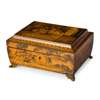Note: The penwork scene decorating the lid of this fine box is adapted from Sir David Wilkie's 1807 painting 'The Rent Day.' One of the interior boxes in the interior also features a detail of this picture as well, and three other genre scenes presumably after Wilkie.