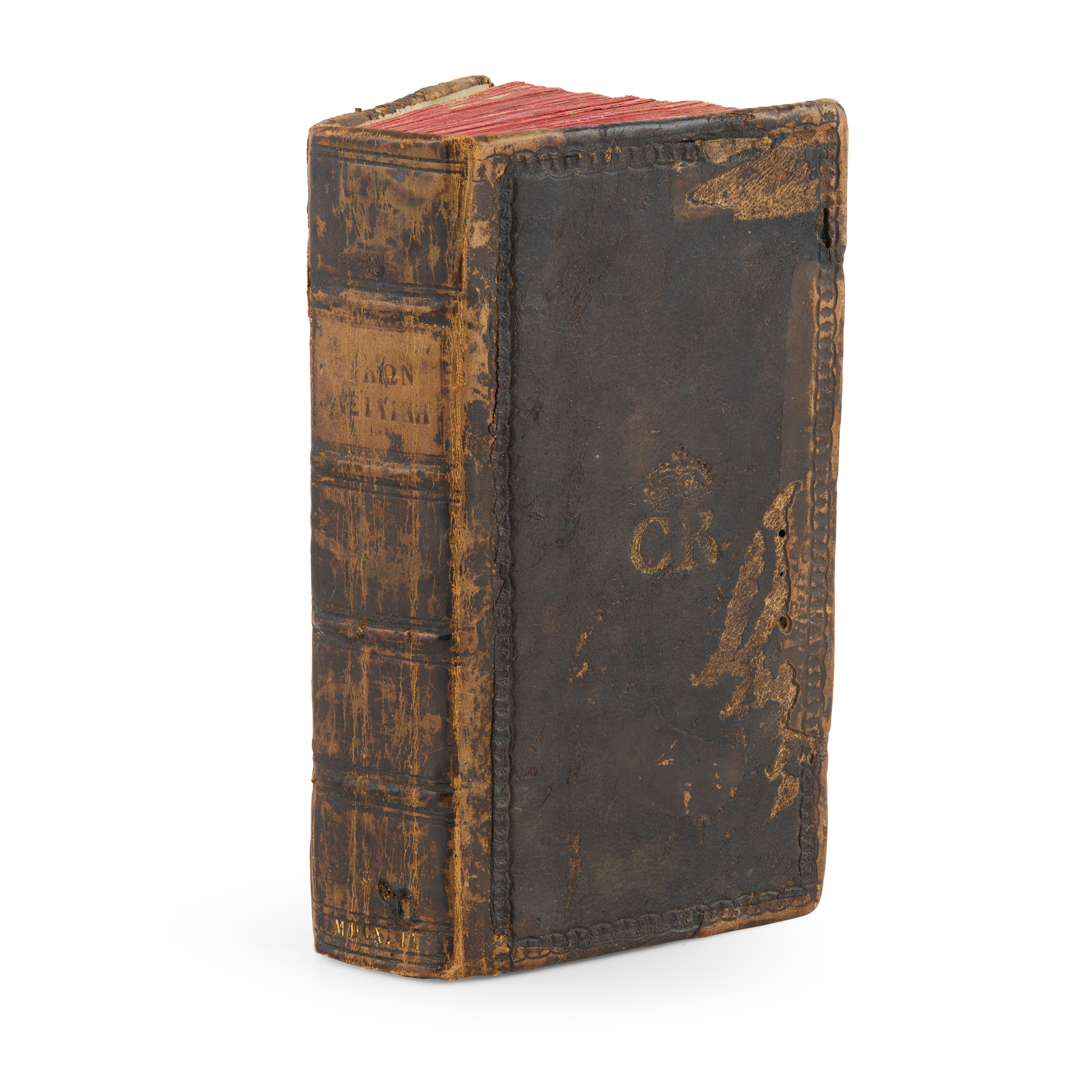 Dernieres Oeuvres de sa Majeste de la Grande Bretagne. The Hague, 1649. 12mo, to include: Eikon Basilike, folding frontispiece incomplete; Prieres de sa Majeste de la Grande Bretagne; Cahiers de la Conference…entre sa Majesté de la Grande Bretagne et le Sr. Alex. Henderson Ministre Escossois, portrait; Metamorphose des Isles Fortunés de la Reyne Dovairiere de la Grande Bretagne; 17th century calf with the royal monogram “CR” and crown to the covers