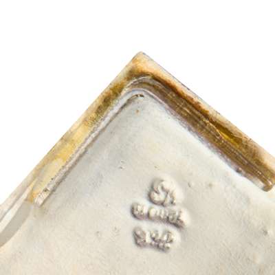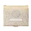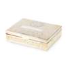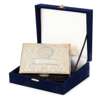 of rectangular outline, embossed scroll decoration and a stippled ground throughout, the plaque with engraved inscription ‘With best compliments From His Majesty Sultan Azlan Shah the Yang d-Pertuan Agong IZ Malyazia’ below the coat of arms of Malaysia, the hinged lid to a double compartment interior, presented in a fitted blue velvet box