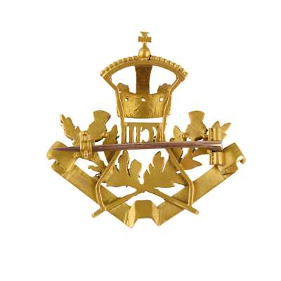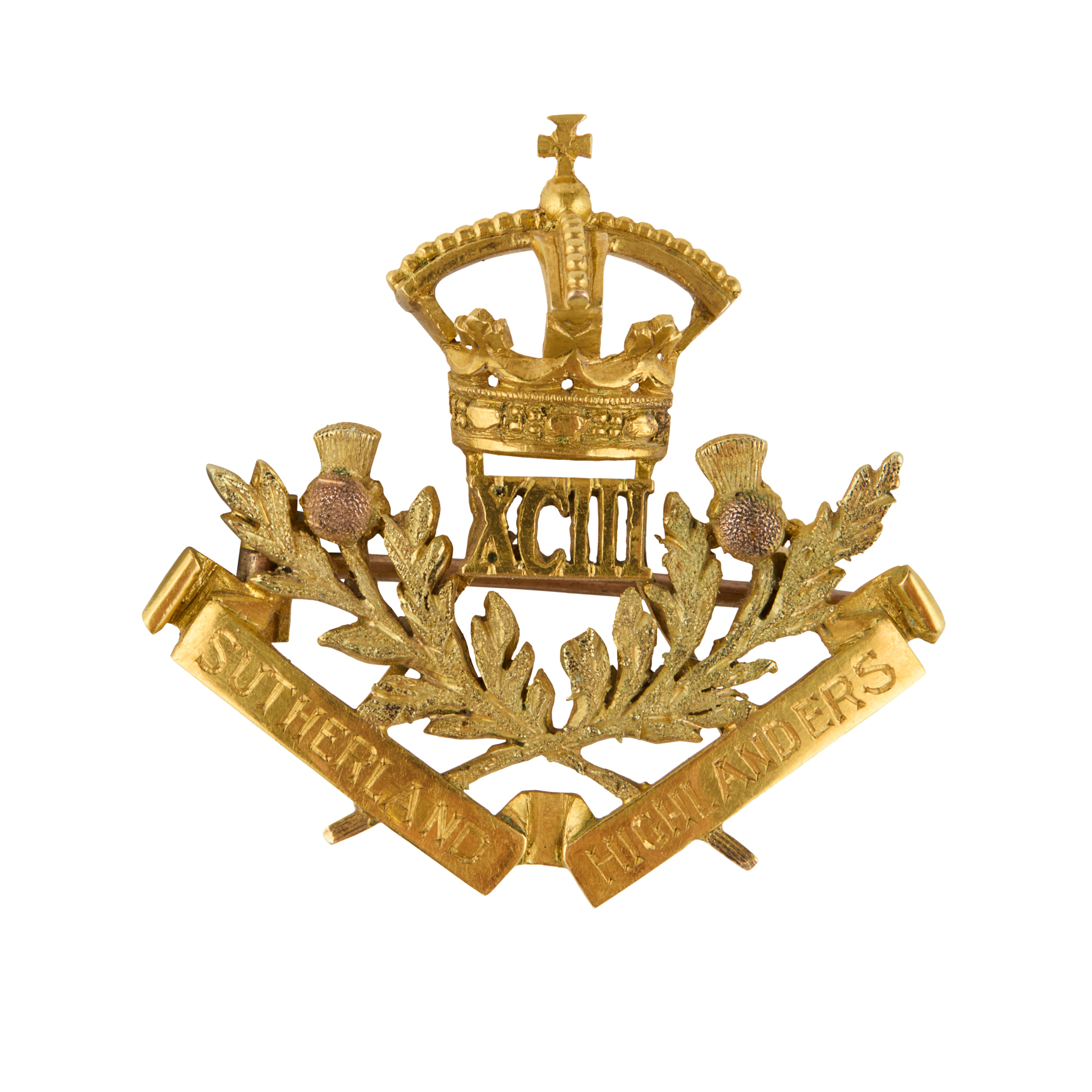 the regimental number XCIII surmounted by royal crown and flanked with displayed thistles, with banner below engraved ‘SUTHERLAND HIGHLANDERS’, with hinged pin and safety claps