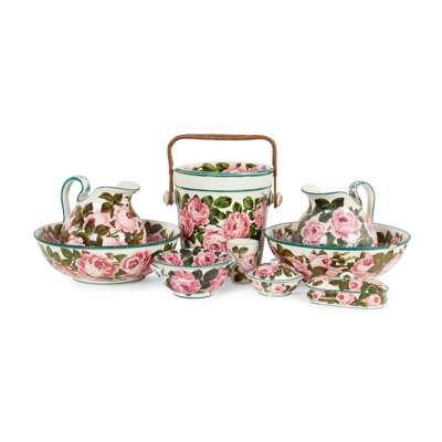 glazed earthenware, comprising; TWO SIMILAR LARGE EWERS AND BASINS, ewers 25.5cm high, basins 39.5cm diameter; a SPONGE BOWL AND DRAINER, 24cm wide; a SOAP DISH AND DRAINER, painted by Joseph Nekola, 15.5cm diameter; a TOOTHBRUSH BOX AND COVER, 20.5cm wide; a BEAKER, painted by Edwin Sandland, 11.2cm high; a SLOP PAIL, 30cm high; various printed, impressed and painted marks (9)