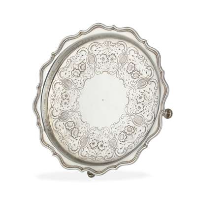 marked thistle, RMcG, tree, baubles, of shaped circular outline with moulded rim, the sunken centre with chased rococo scroll formed cartouches with foliate displays within, raised on four scroll and hoof feet