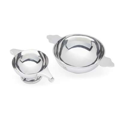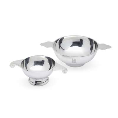 of traditional plain form, moulded lugs, raised on a circular foot; together with another smaller, Hayward & Stott, Edinburgh 2006, with scroll lugs (2)
