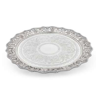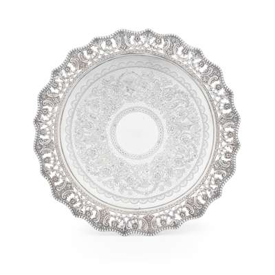 of shaped circular outline, cast pierced floral border with beaded edge, engraved scroll decoration to the dish, raised on three ball feet