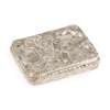of rectangular outline, the hinged cover with embossed countryside scene of a bagpiper seated under a tree in the countryside serenading a maiden, the base with foliate and flower head trailing around