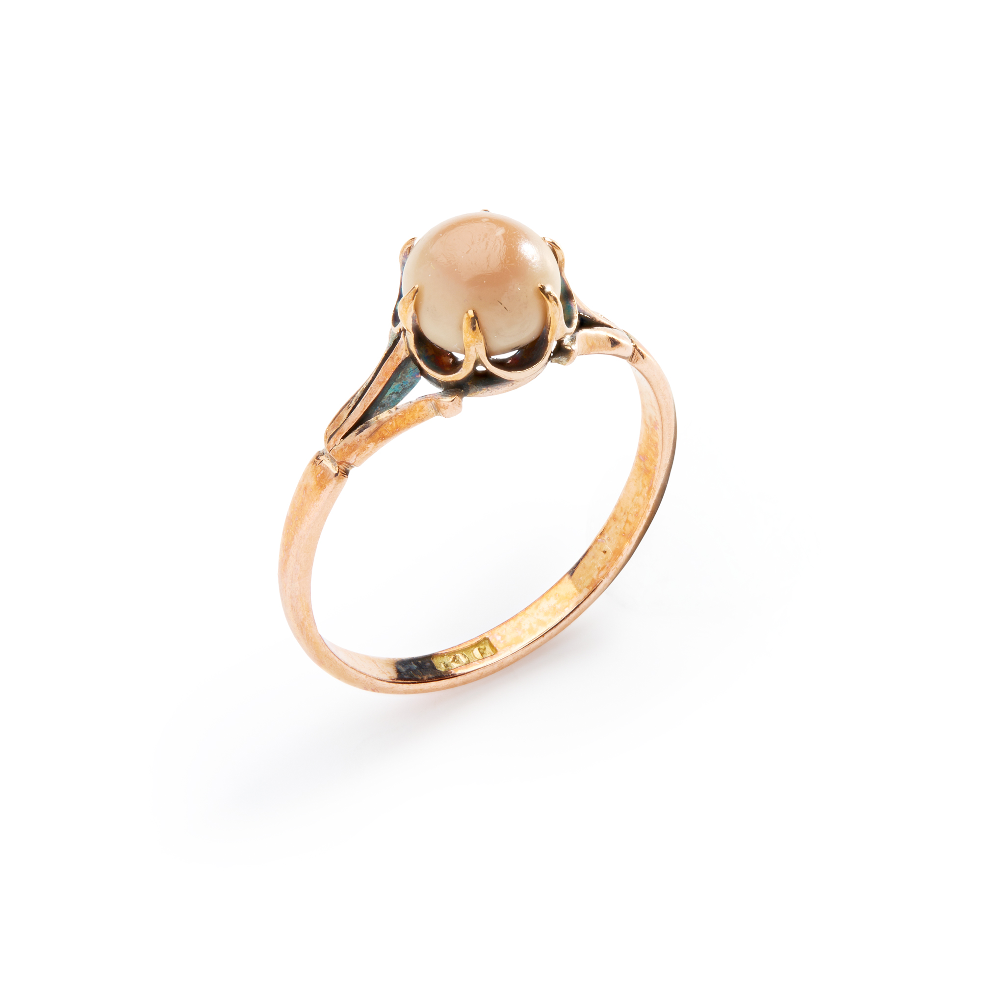 claw-set with a brownish Scottish freshwater pearl, plain band, stamped 9ct