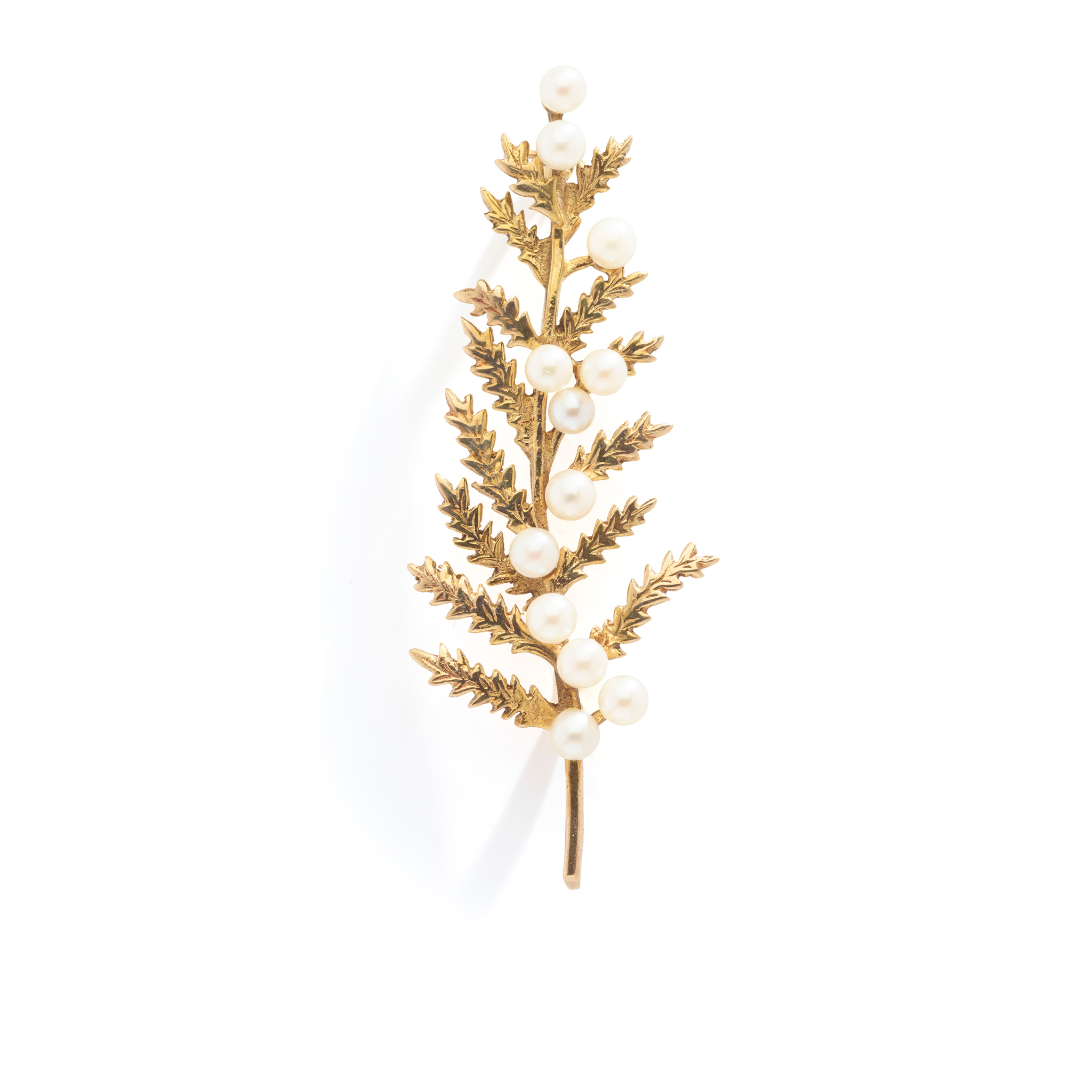 CAIRNCROSS OF PERTH: A 9CT GOLD SCOTTISH FRESHWATER PEARL 'FERN' BROOCH