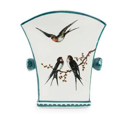 glazed earthenware, moulded and painted to one side with a cockerel chasing a fly, and painted on the reverse with three swallows, impressed maker's mark WEMYSS WARE/R H & S