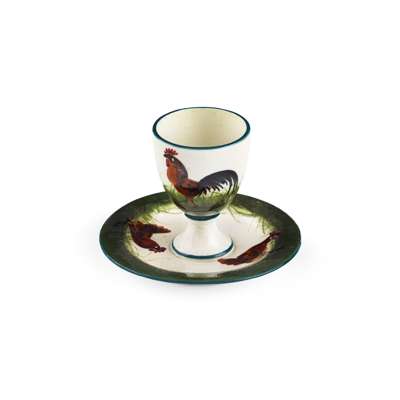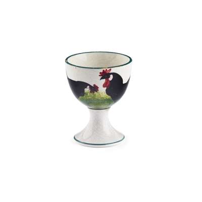 to include a 'BROWN COCKEREL AND HENS' EGG CUP AND SAUCER, glazed earthenware, painted and impressed maker’s mark WEMYSS, 7cm high; a 'BROWN COCKEREL AND HEN' EGG CUP, glazed earthenware, impressed maker’s mark WEMYSS, printed retailer's mark, 6.5cm high; a 'BLACK COCKEREL AND HENS' EGG CUP, glazed earthenware, impressed maker’s mark WEMYSS, 6.6cm high; and a 'BLACK COCKEREL & HENS' EGG CUP, glazed earthenware, painted and impressed maker's mark WEMYSS, 6.2cm high