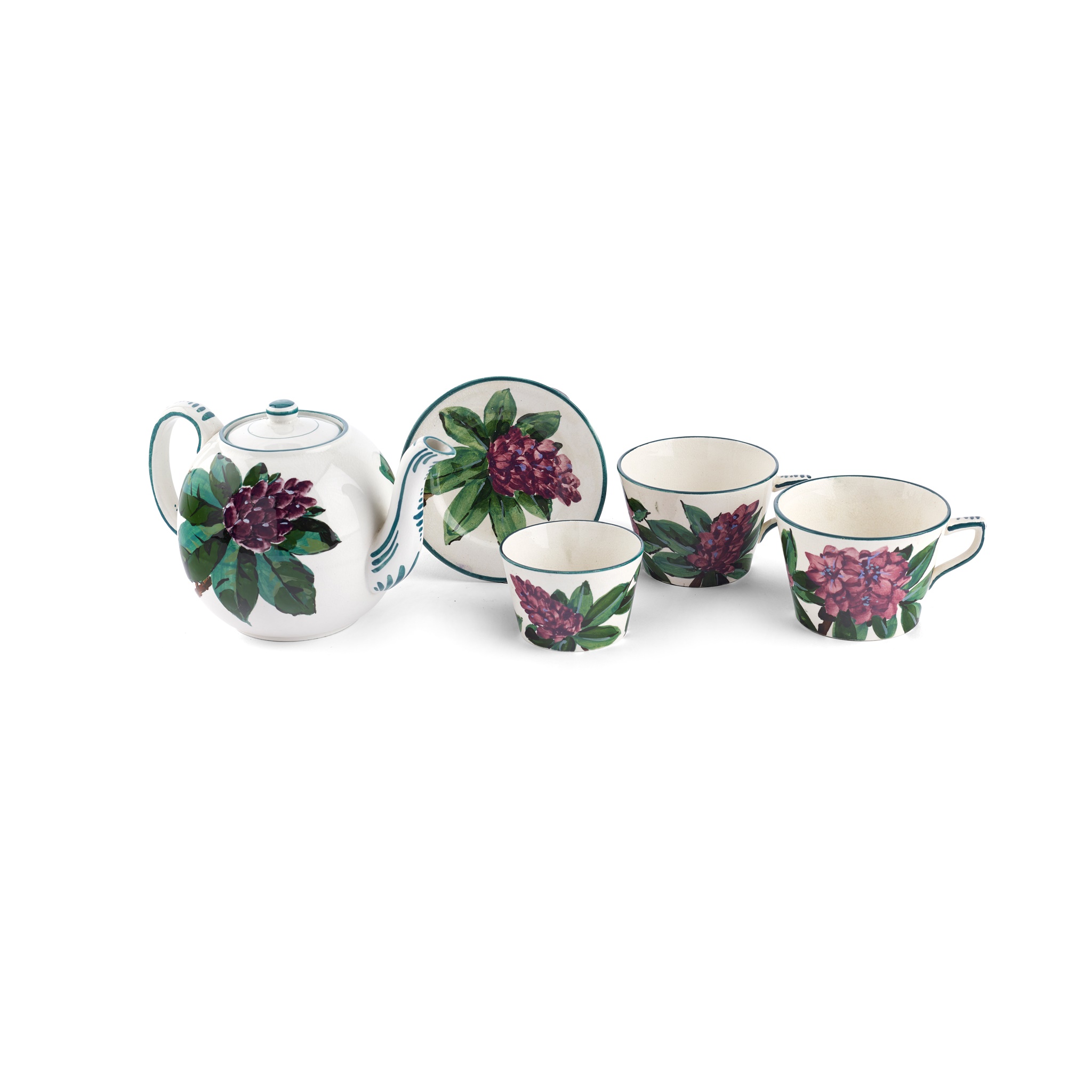 glazed earthenware, painted by Karel and Joe Nekola, comprising a TEAPOT, 13cm high; TWO CUPS, 9.5 and 9cm diameter; a SUGAR BOWL, 7.5cm diameter; and a SMALL PLATE, 11.5cm diameter, impressed maker’s mark WEMYSS, painted Thomas Goode & Co. retailer's mark (variously painted) (5)