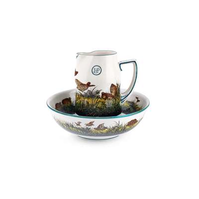 glazed earthenware, painted by Karel Nekola, all inscribed with monogram HP, complete with EWER & BASIN, 29.5cm high and 39cm diameter; SPONGE BASIN, with liner, 25cm wide; COVERED SOAP DISH, with liner, 14.5cm diameter; BEAKER VASE, 11cm high; and CHAMBER POT, 26.5cm diameter, painted and impressed maker’s mark WEMYSS, painted Thomas Goode & Co. retailer's mark