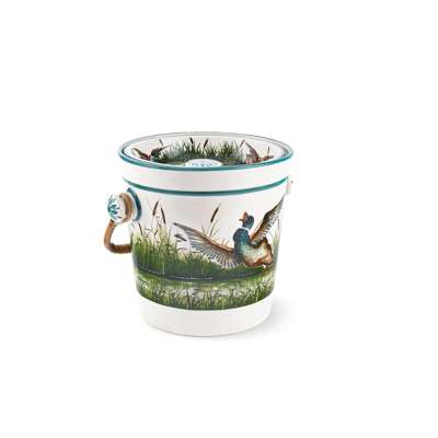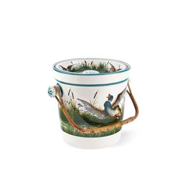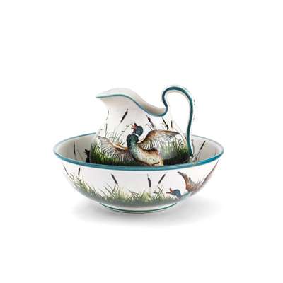 glazed earthenware, painted by James Sharp, comprising a EWER and BASIN, 24cm high and 39.5cm diameter; SLOP PAIL, 29cm high; COVERED TOOTHBRUSH BOX and LINER, 20cm long; SOAP DISH and LINER (lacking its cover), 15cm diameter, painted and impressed maker’s mark WEMYSS, painted Thomas Goode & Co. retailer's mark (variously marked)