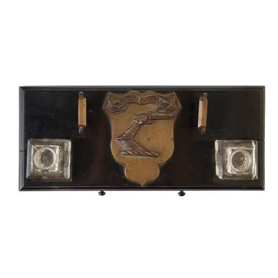 with applied cast brass armorial with inscription PERCUTE ITERUM, with twin glass inkwells and drawer below