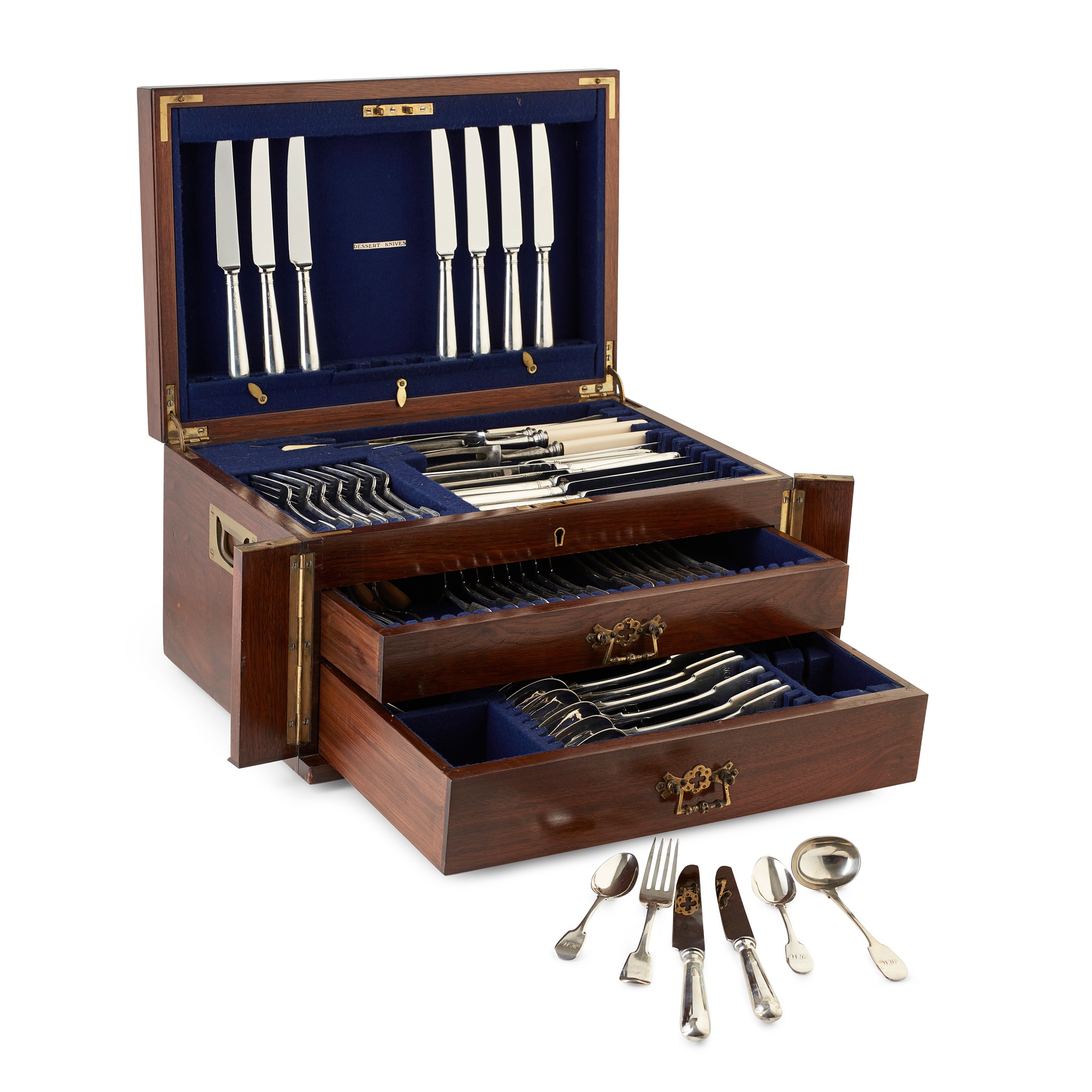 for eight covers comprising tablespoons, table forks, dessert spoons, dessert forks, teaspoons, pair of sauce ladles, soup ladle and serving spoon, all of Fiddle pattern with various engraved initials, in a later fitted canteen with carving set and modern silver handled table and dessert knives