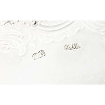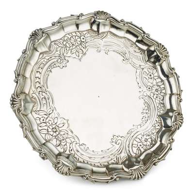marked CA, ABD, of shaped circular outline with scroll and shell border, the inner flat with chased foliate scrolls and flower heads, raised on three scroll feet