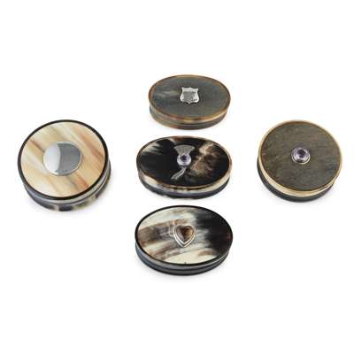 marked W.D.&Co., S, 925, of circular form, with applied vacant circular cartouche to pull off lid, the underside with glass base; together another circular snuff box, collet set with a mixed-cut amethyst to centre, the underside with glass base; together with an oval snuff box, with applied silver shield, Dunningham & Co, Edinburgh 1933, with engraved italic A to centre; a similar oval box, collet set with a heart shaped citrine and another with applied white metal thistle an collet set with faceted amethyst to centre