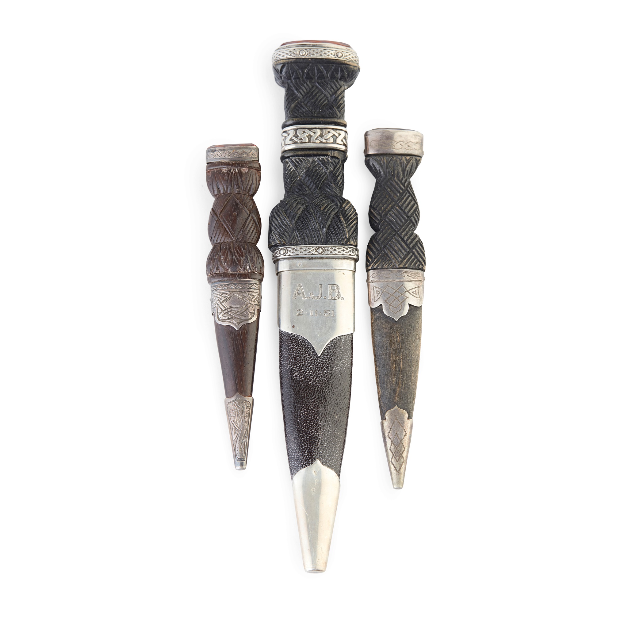 marked A&JS, Edinburgh 1951, the carved wooden handle with applied Celtic band to centre, and paste to pommel, the scabbard with simple engraved AJB 2-11-51: together with a Victorian Sgian Dubh kilt pin, Edinburgh 1898 and with a boy's dummy Sgian Dubh