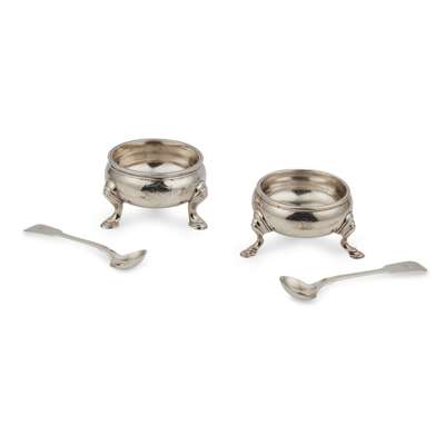 marked CA, CA and marked IG, each of cauldron form with moulded rim and raised on three stepped foot, the Gordon example with engraved armorial; together with a pair of Fiddle pattern salts spoons by G Sangster of Aberdeen with Edinburgh marks 1860