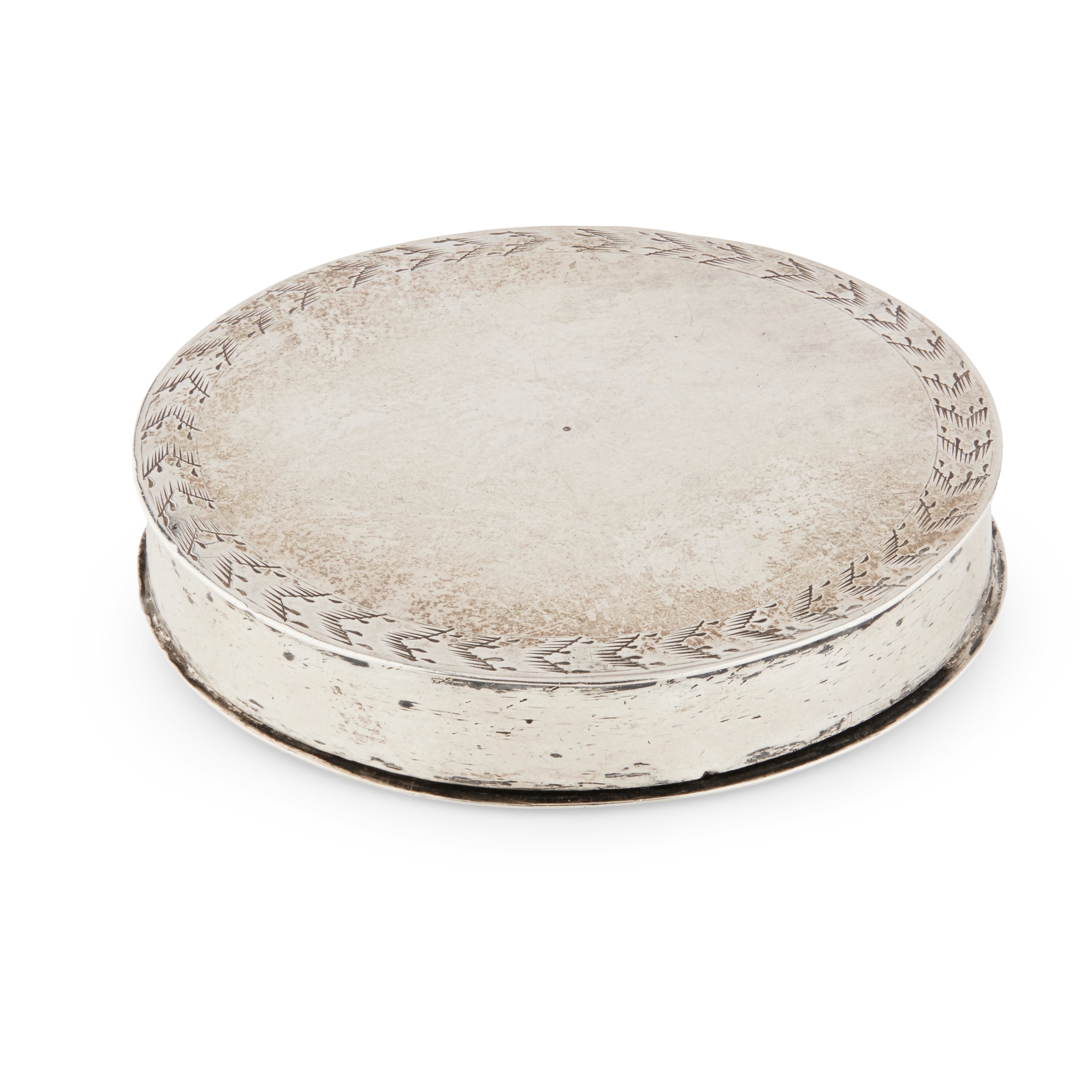 maker's mark only to inside of base, the circular box with straight sides and pull off cover, engraved to the border with simple stylised foliate border, the base section with rectangular aperture for ribbon