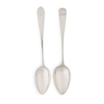 marked CF, ELGIN, C, of Old English pattern with script initials; together with a Scottish provincial desert spoon by William Clarke of Greenock, marked WC, anchor, C, oak tree of Celtic Point pattern with script initials