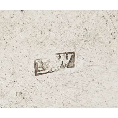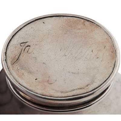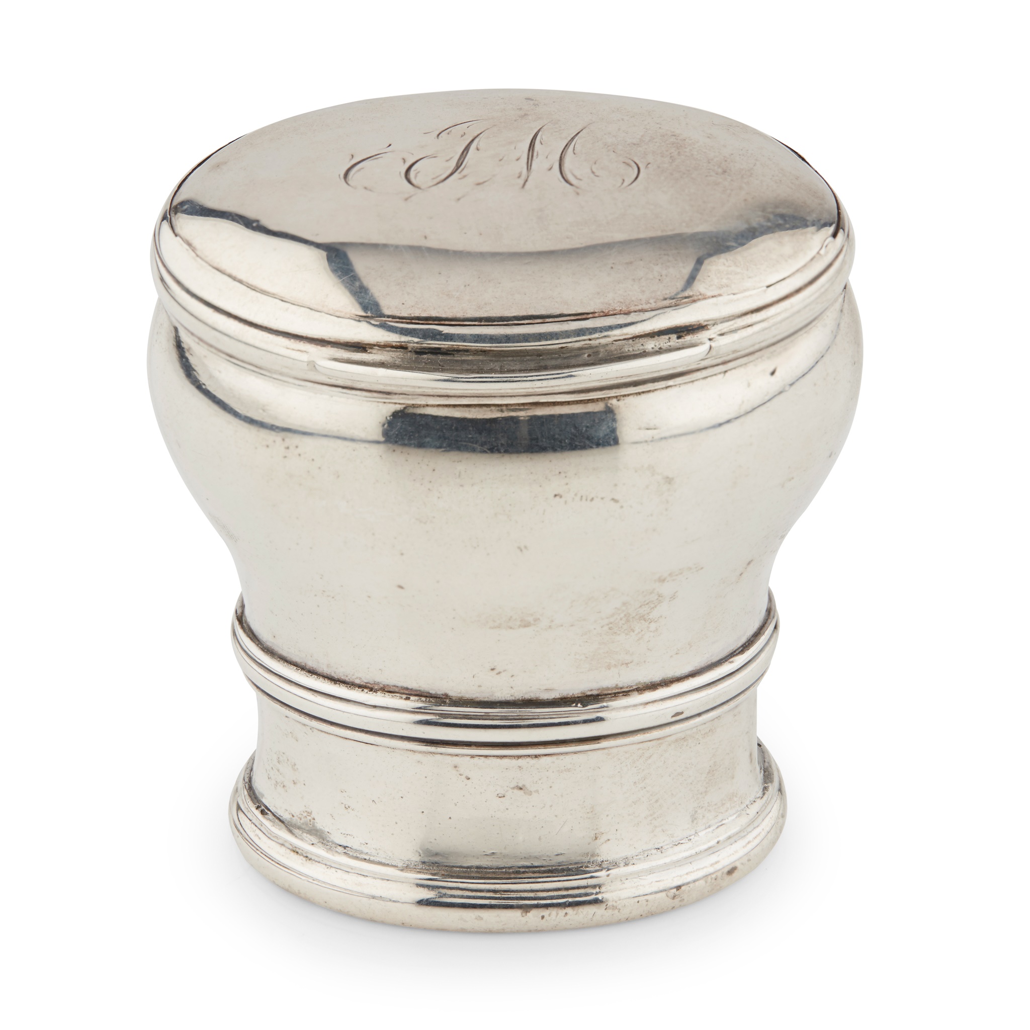 maker's mark only, of large typical inverted baluster form with reeded foot and girdle, the base with initials JA in script, the domed hinged cover with script initials JM