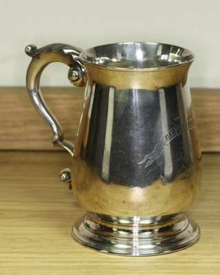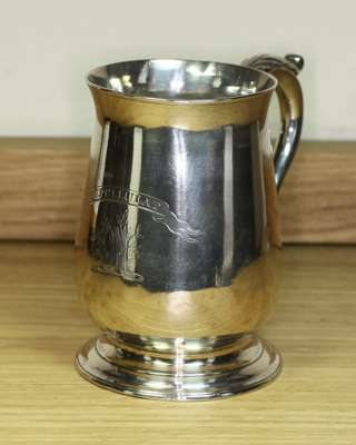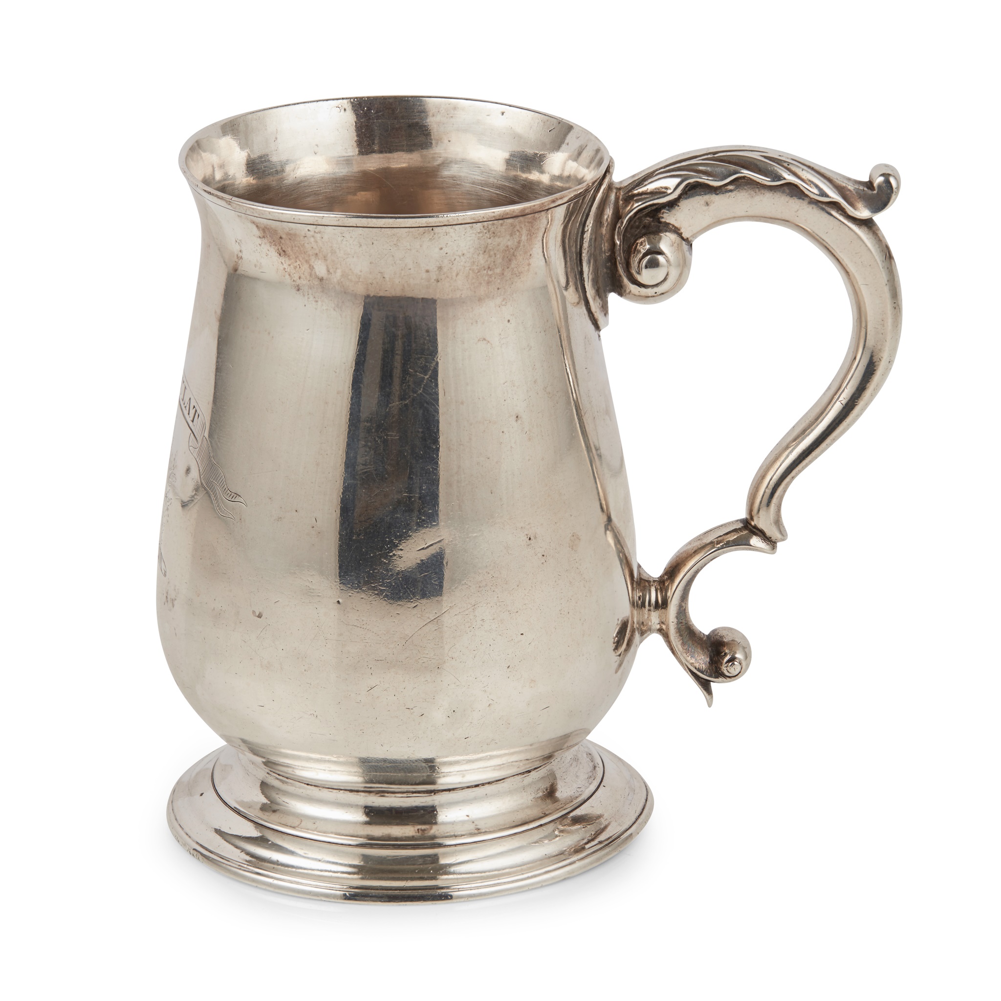 attributed to Glasgow circa 1760 single mark H&M, of typical baluster form engraved crest and motto, scroll handle with leaf clasping, spreading circular foot