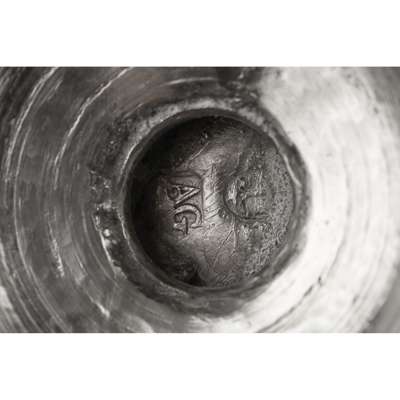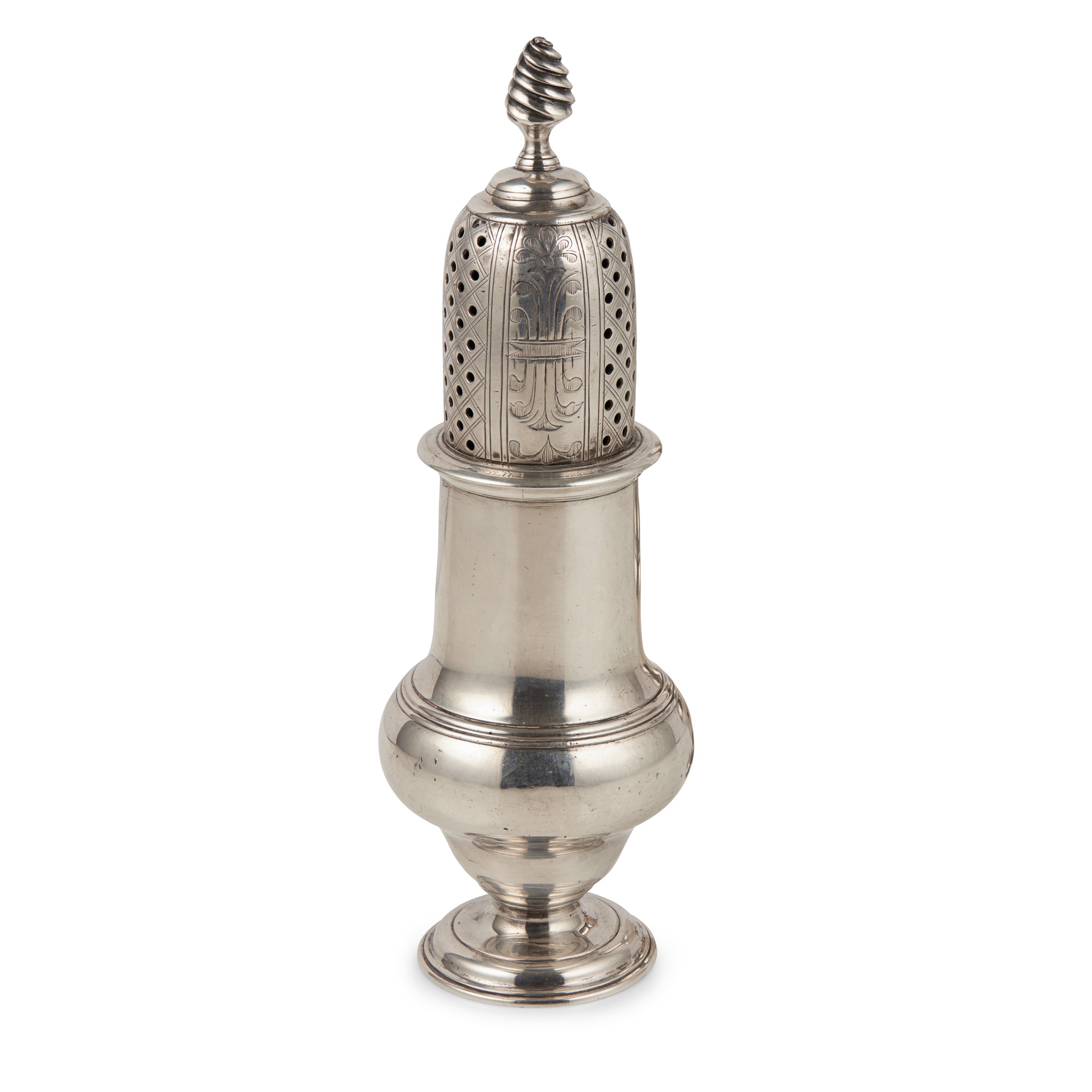 marked AG, town mark, of conventional baluster form with domed foot, the pull off cover with pierced and engraved alternating panels and wrythen finials
