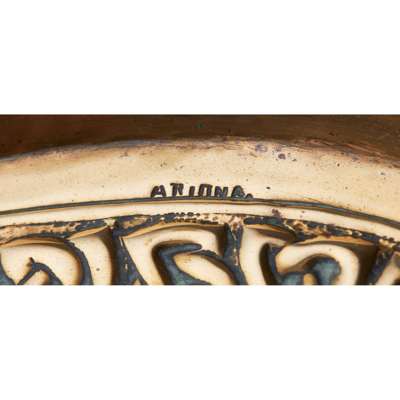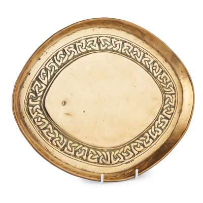 signed AR IONA to border, the pointed oval tray with Celtic interlace border and plain centre