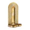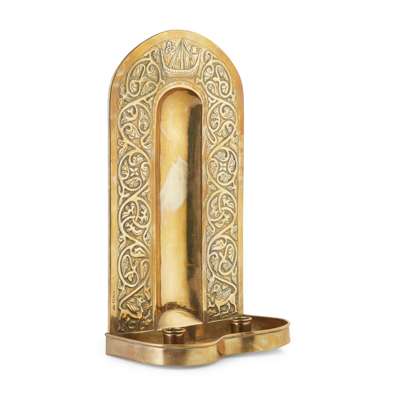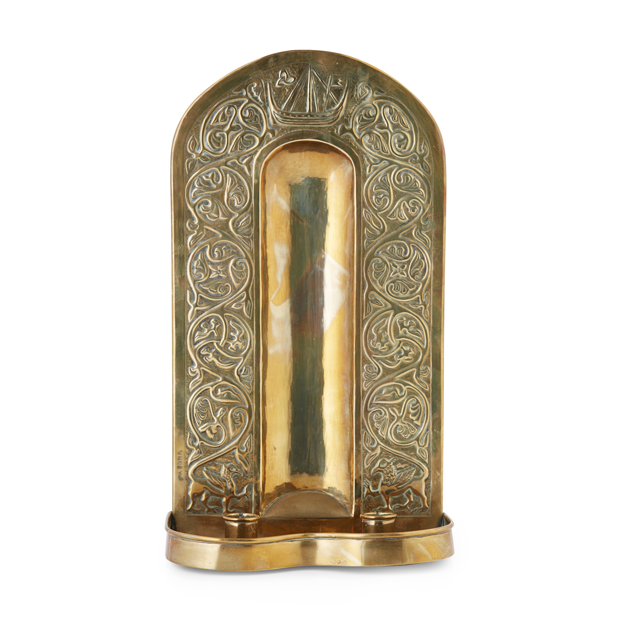 signed AR IONA to border, the arched back plate with intricate ivy leaf and foliage flanking a galleon to top, surrounding a plain concave well, the shaped base with twin scones, with hanging loops to reverse