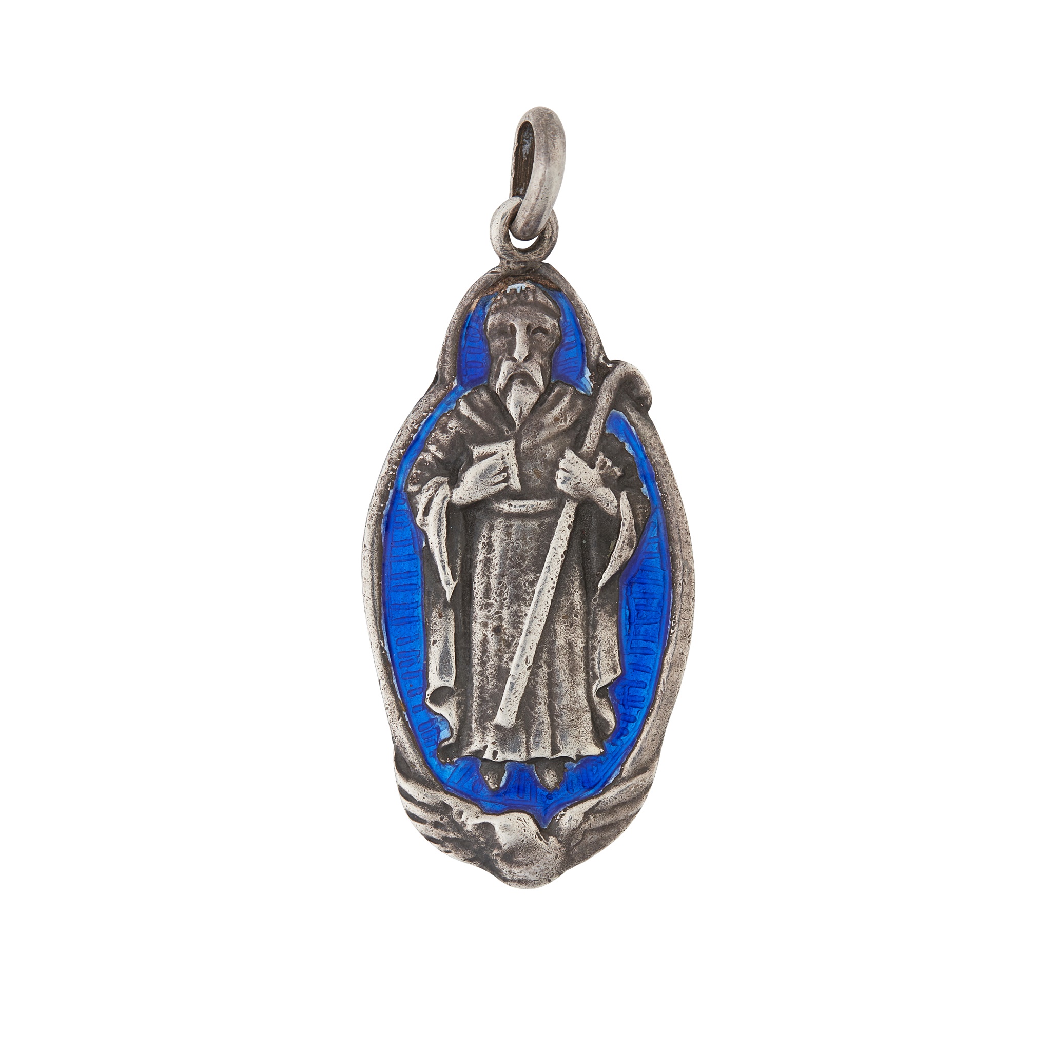 Birmingham 1933, the shaped oval pendant with figure of St Columba with blue enamel surround, the reverse integrally signed SAINT COLUMBA IONA
