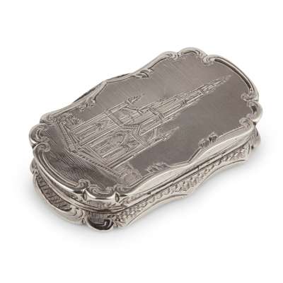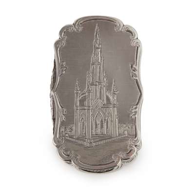 of moulded rectangular form, the hinged lid engraved with a depiction of the Scott Monument, the interior with a foliate pierced grill