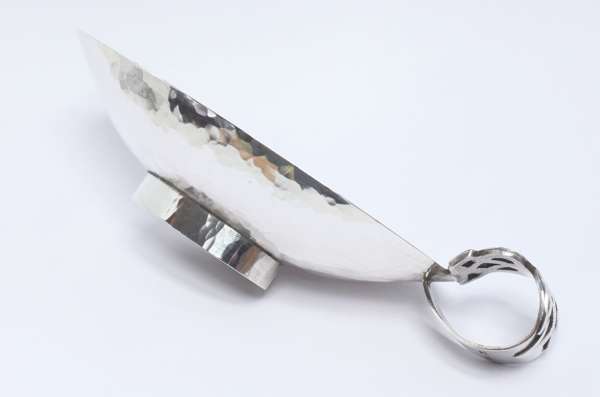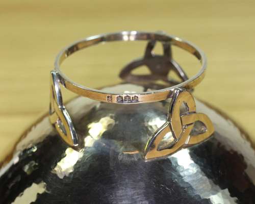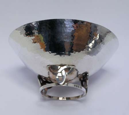 the pin trays Rita Ferguson, Edinburgh 1937, the planished elongated oval bowls with curled Celtic knot loop handle and all raised on ring foot; together with a small comport, Bertha Inglis, Edinburgh 1932, of planished conical form raised on a Celtic ring foot
