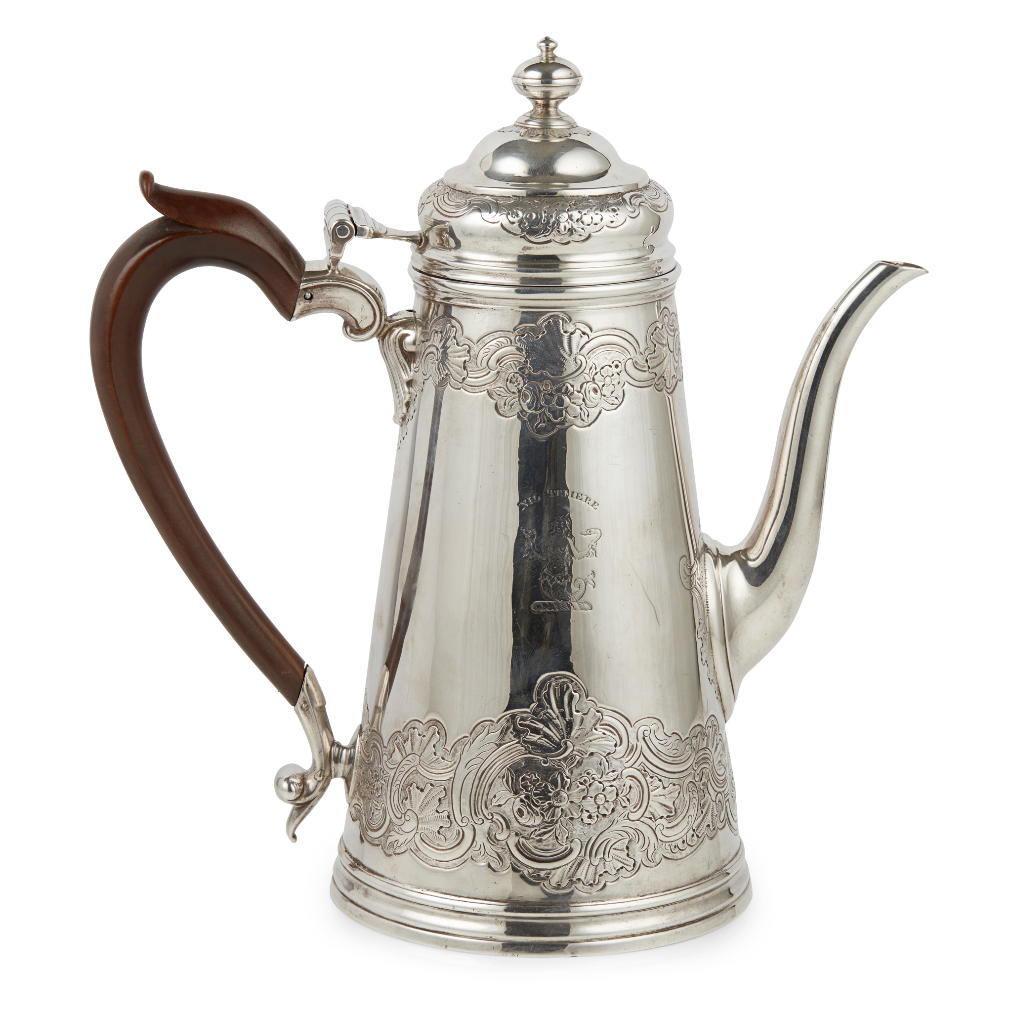 This crest is that borne today by the Lords Balfour of Burleigh in the County of Kinrossshire. Given that the motto is dissimilar to the peerage family there is a likelihood that this coffee pot was once in the possession of a cadet branch of the family. Certainly, the motto ‘Nil temere’ as engraved above the crest is used by other branches of the Balfour family, but not with the same crest or at least one that is slightly differenced.