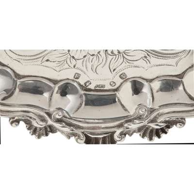 of circular form with cast shell border, heavily decorated floral border with vacant centre, raised on three bracket feet