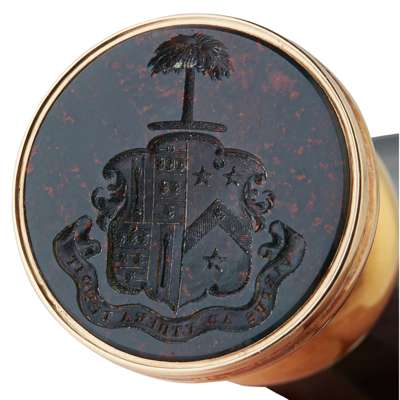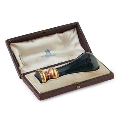 the faceted baluster blood stone handle to a gold collar and mount, the bloodstone matrix intaglio carved with full armorial, in original fitted case inscribed to lid for Mortimer and Hunt