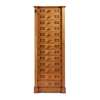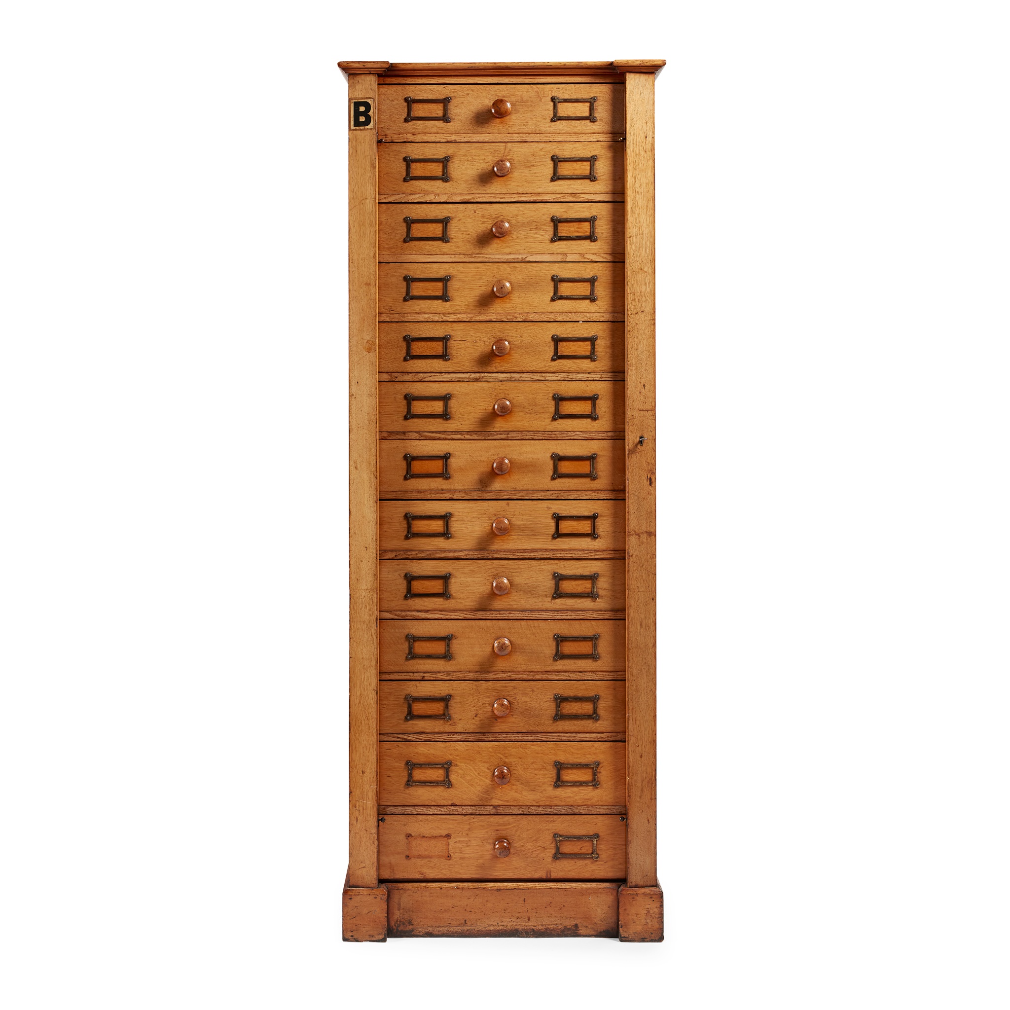 the moulded cornice above 13 deep drawers, each with applied brass label holders and turned handles, enclosed by lockable hinged closures and raised on a plinth base