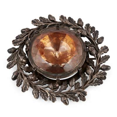 unmarked, the shaped circular outline formed of intertwined oak leaves and acorns, centrally set with a large foil backed paste, with hinged pin to reverse